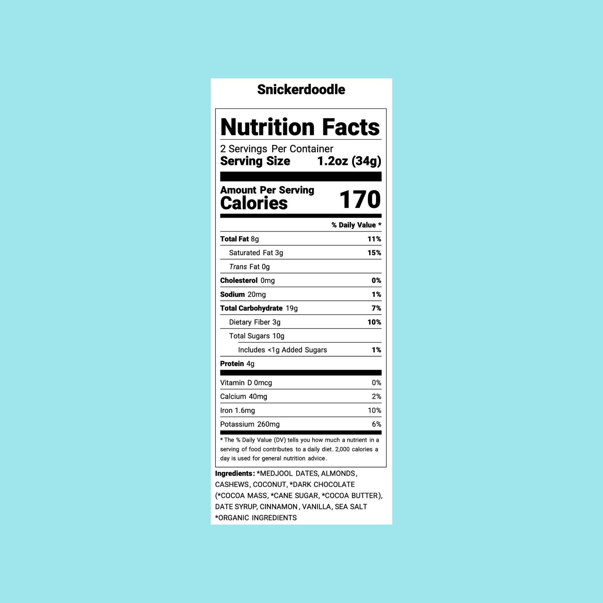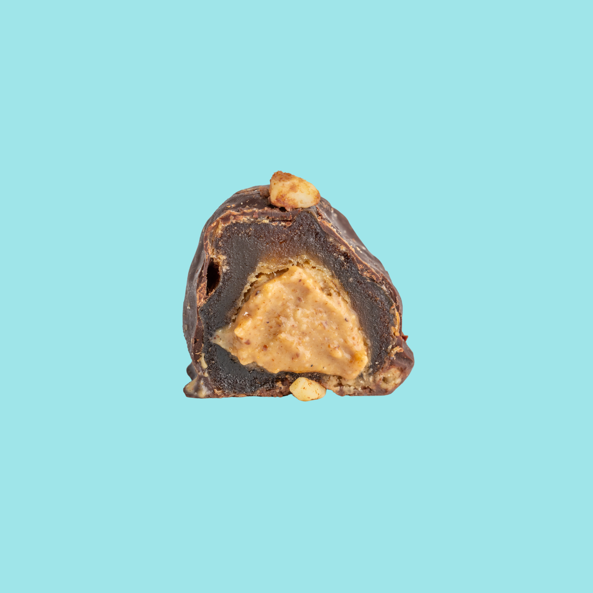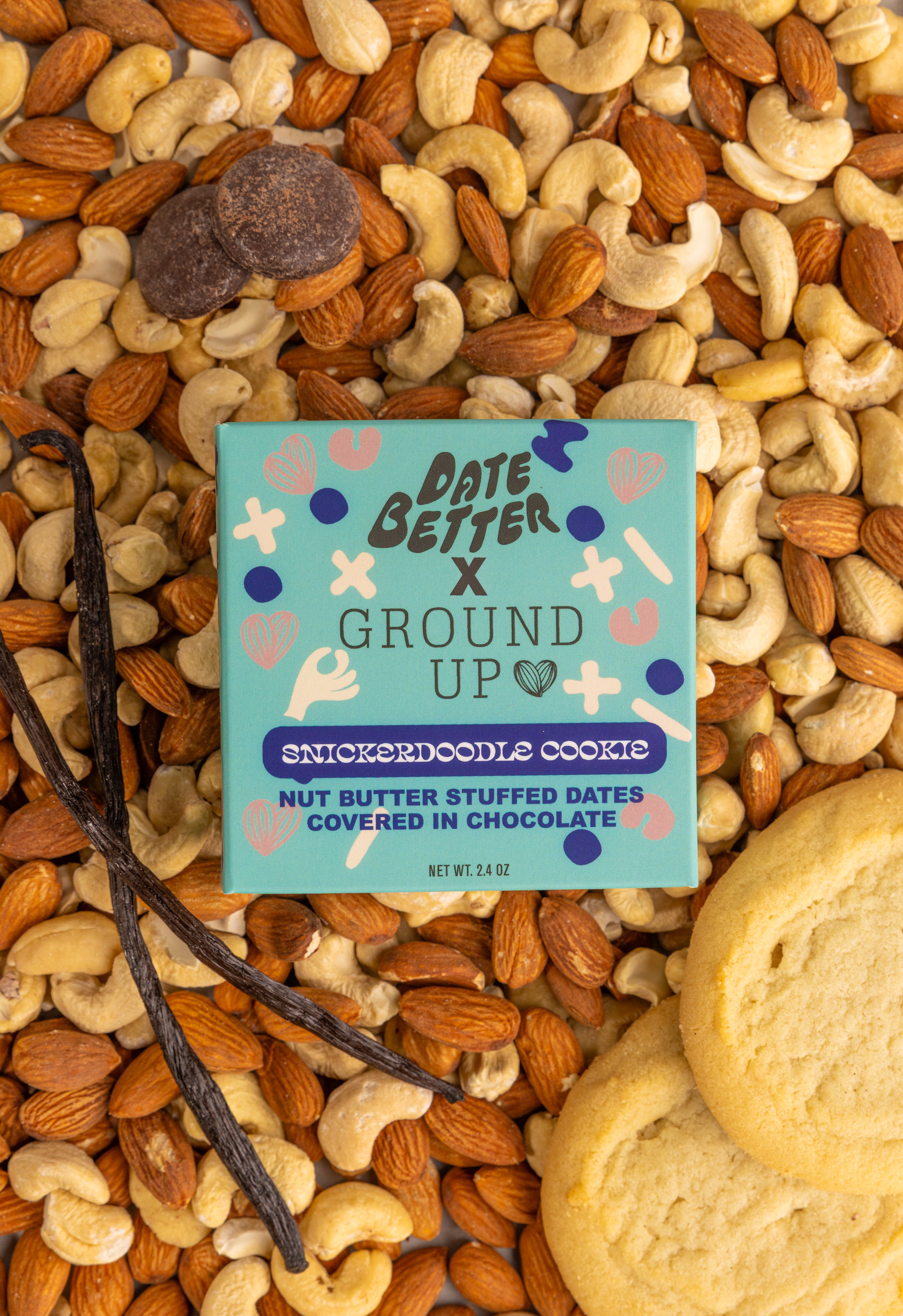Snickerdoodle nut-butter stuffed, chocolate covered dates. Chewy Medjool dates are stuffed with our iconic Cinnamon Snickerdoodle Nut Butter, speckled with cinnamon dusted almond pieces. They are then enrobed in organic, fair trade 85% dark chocolate that is free from any soy or emulsifiers.